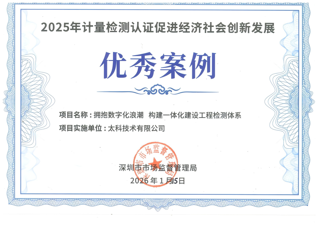 近日,深圳市市场监督管理局正式发布 “2025年计量检测认证促进经济社会创新发展”优秀案例,太科技术有限公司的“拥抱数字化浪潮,构建一体化建设工程检测体系”案例成功入选,公司代表受邀参会并领取荣誉,充分彰显太科技术在建设工程检测数字化领域的创新实力与行业标杆地位。